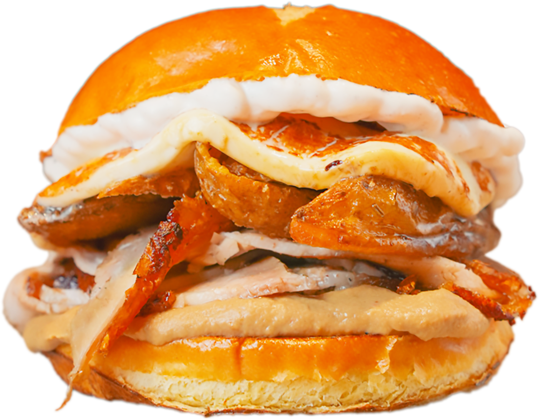 Bun con porchetta Selezione Gustamm, provola di agerola filante, crema di funghi porcini, patate al forno, maionese Gustamm al pepe nero.