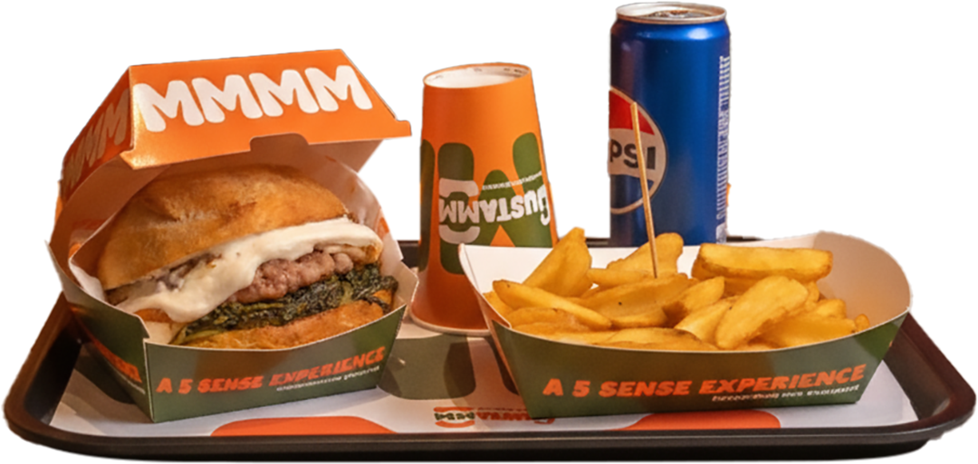 Panino a scelta tra quelli a menu + Patatine a scelta (Crispers – Vertigo +1€ puoi aggiungere Cheddar, Bacon o Salsiccia) + Bibita a scelta (Acqua – Pepsi – Pepsi Max – 7Up – Mirinda)