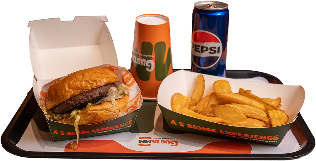 Un panino a scelta tra: •Bun con hamburger 160g selezione Gustamm •Bun con tender di pollo selezione Gustamm + Una porzione di patatine (Crispers o Vertigo) +Una bibita analcolica +Extra opzionali: Insalata (free) • Provola (+1€) Fonduta di formaggio (+1€)