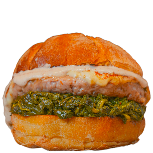 Hamburger di maiale 160gr selezione Gustamm, friarielli napoletani, provola di Agerola e maionese alle mandorle.