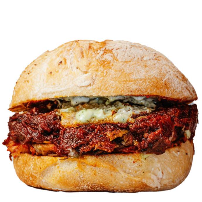 Carne al ragù napoletano, parmigiana di melanzane, cialda di parmigiano, maionese al basilico.